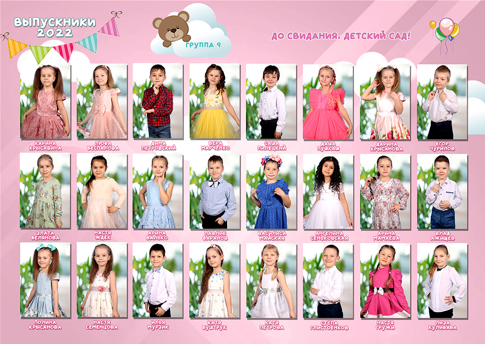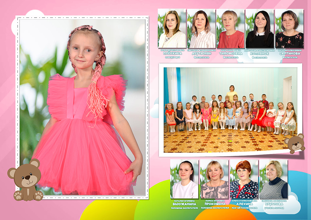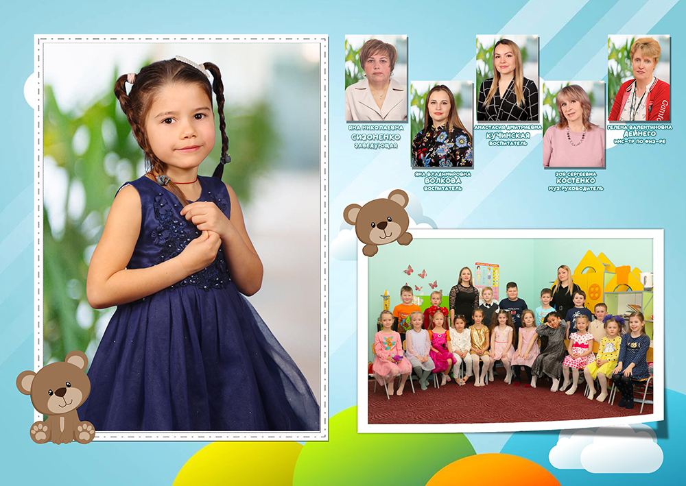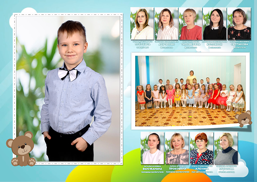 Разворот с портретом выпускника, сотрудниками детского сада и общей фотографии.