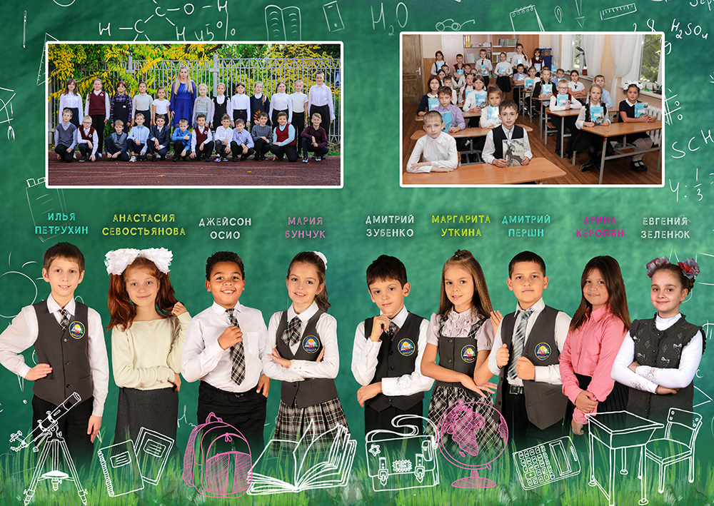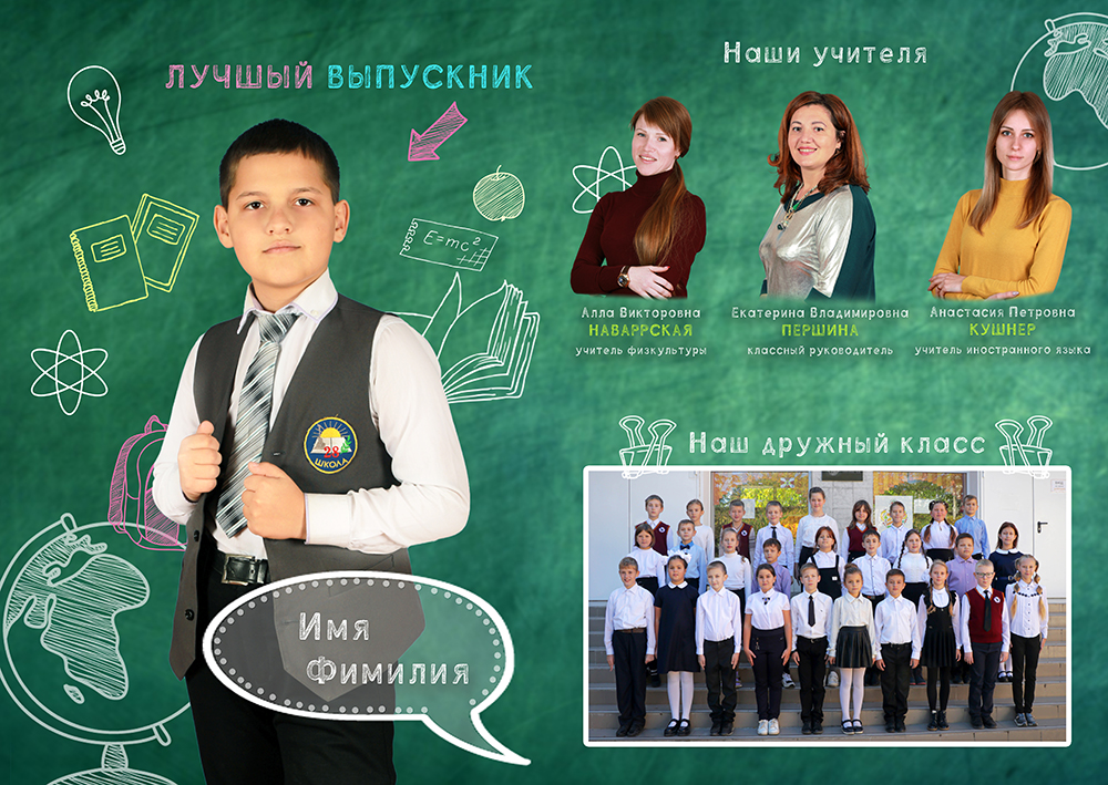 Первый вариант первого разворота. Портрет выпускника, учителя и общая фотография.