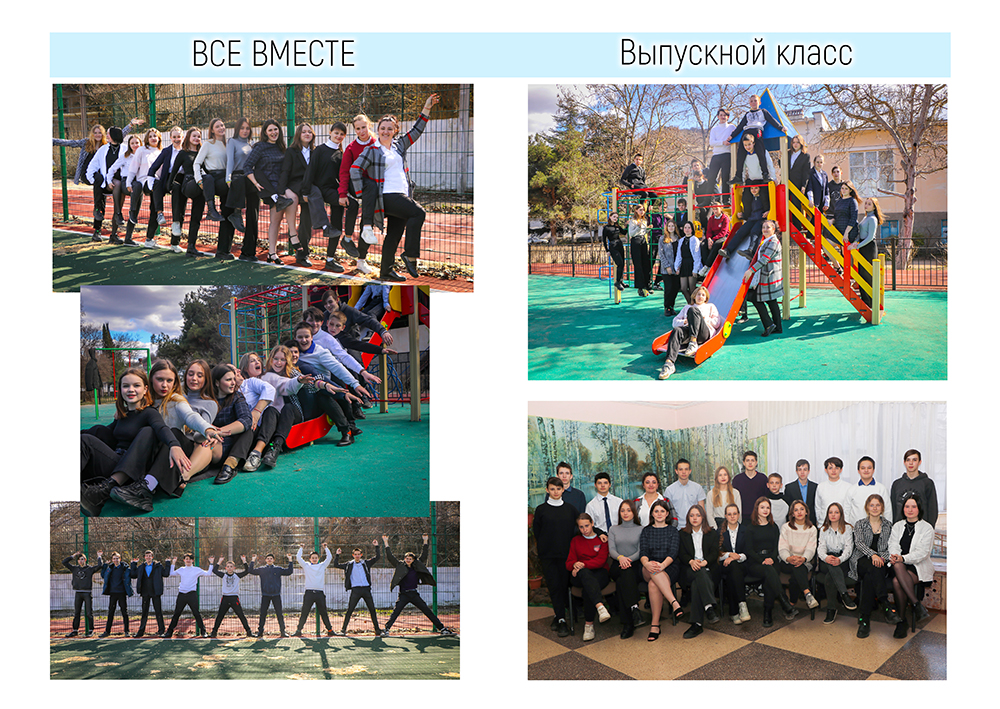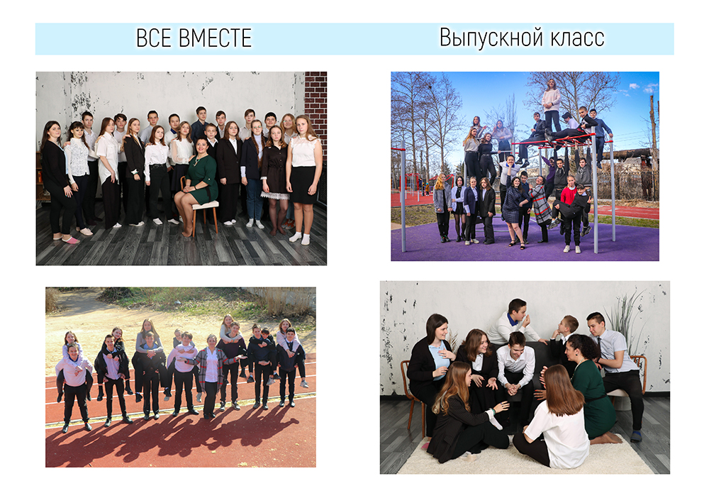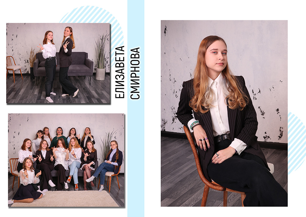 Первый разворот индивидуальный. Портрет, фото с друзьями и групповое фото.